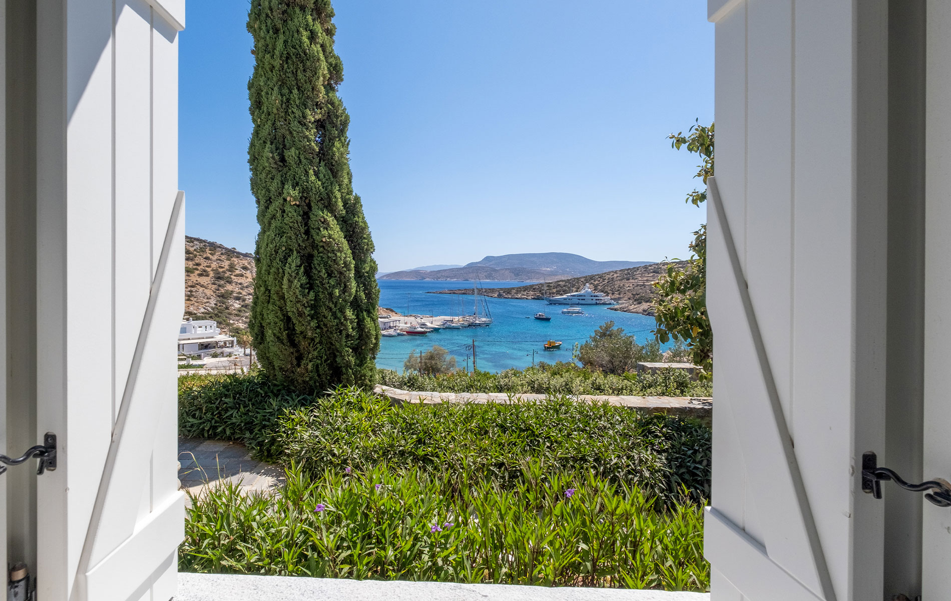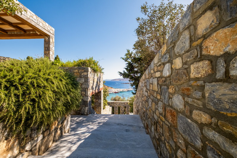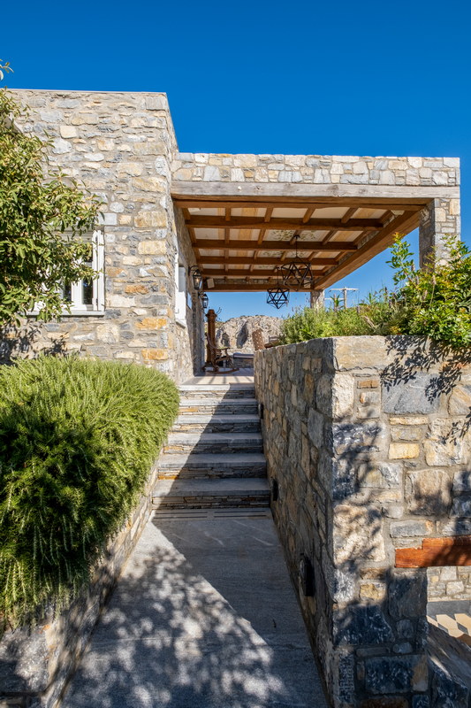Movement through the property follows a calm rhythm — shaded walkways, controlled perspectives, soft lighting, and framed views toward the Aegean. The experience is defined by privacy, sea view, refined luxury, and high aesthetic standards.